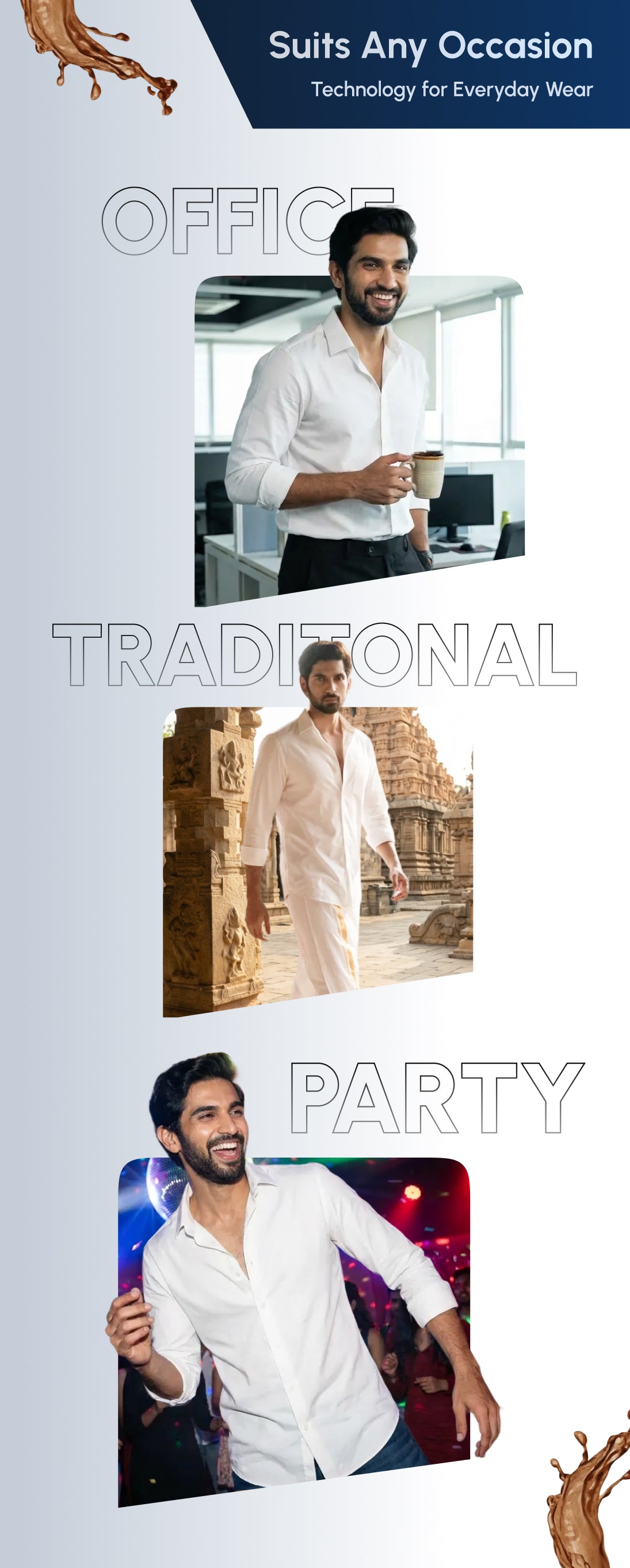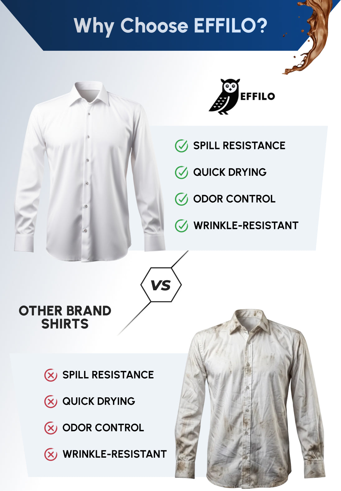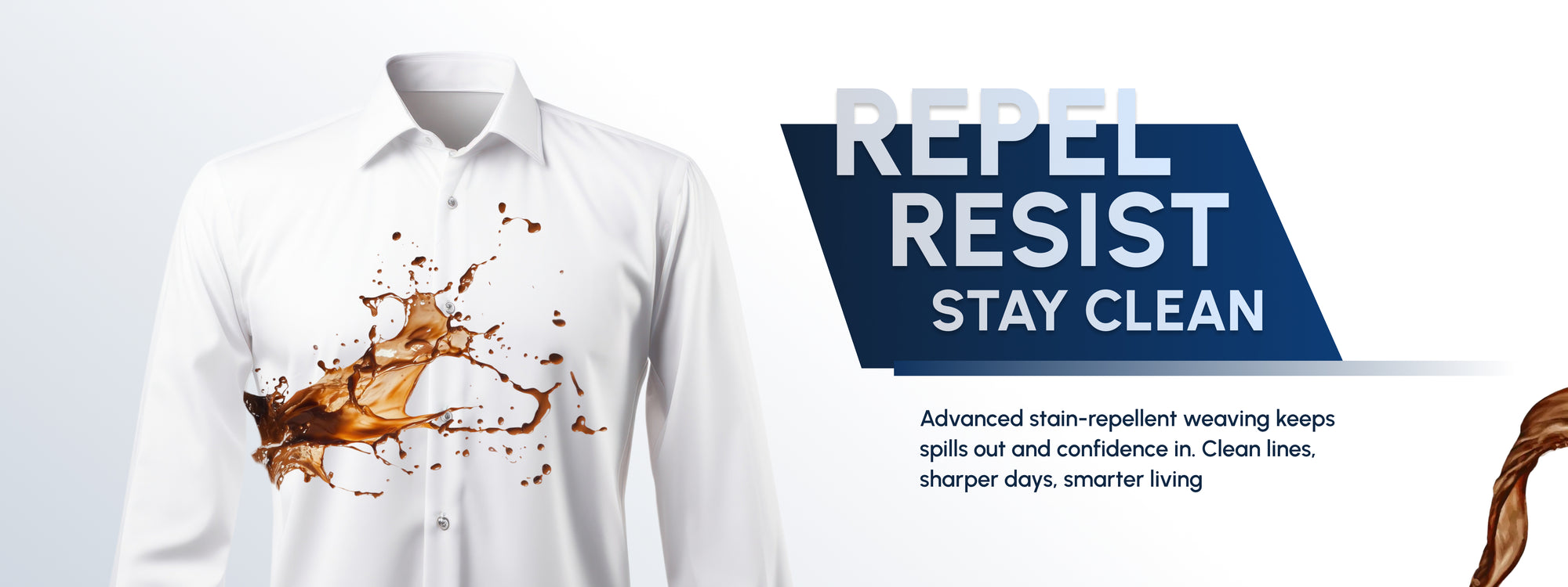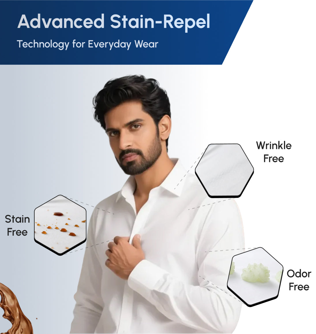 A shirt that protects itself. Advanced stain-repellent cotton keeps water-based spills from setting in, so your whites stay pristine. Tailored slim fit, timeless design, and breathable comfort for men who lead from the front.