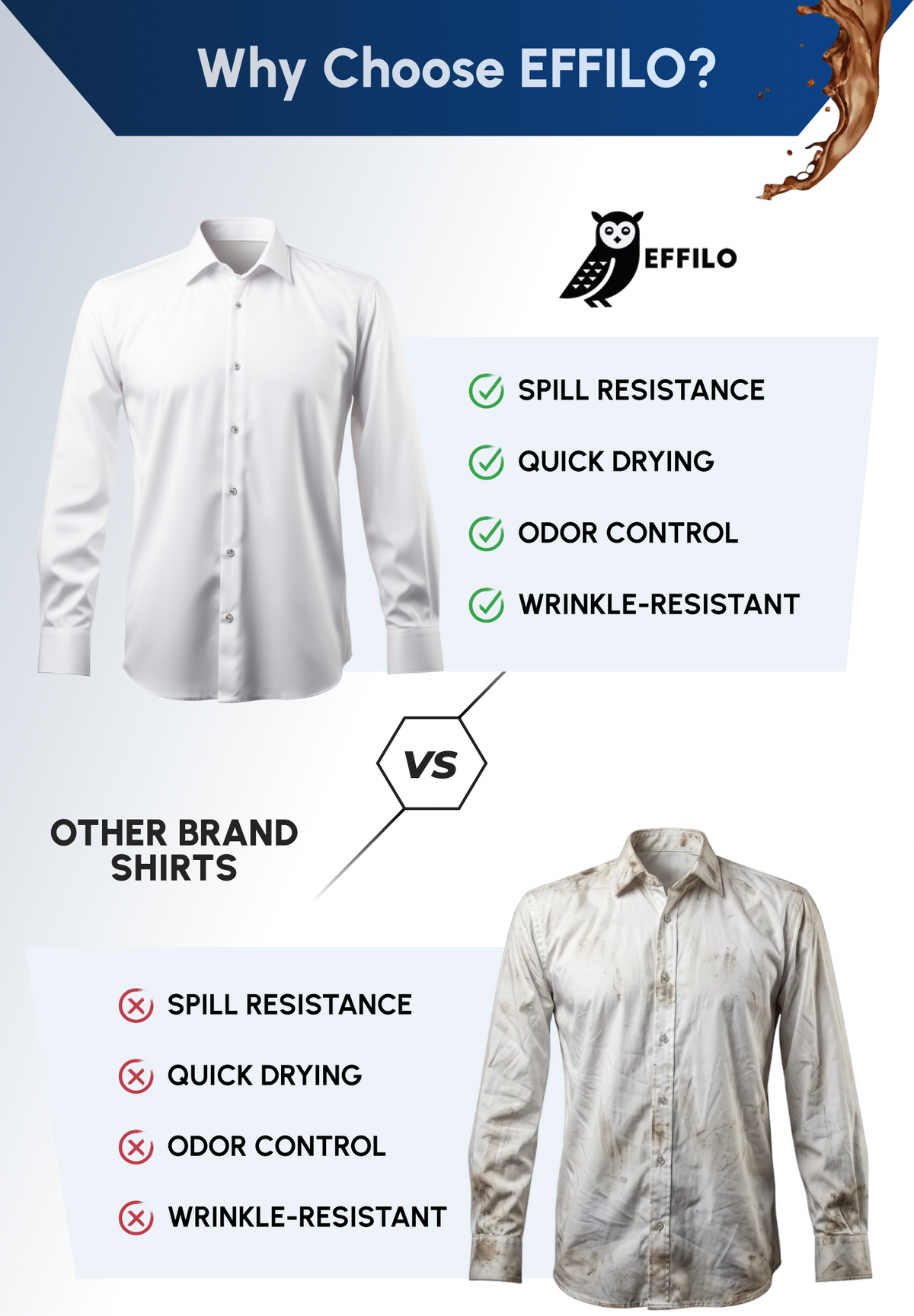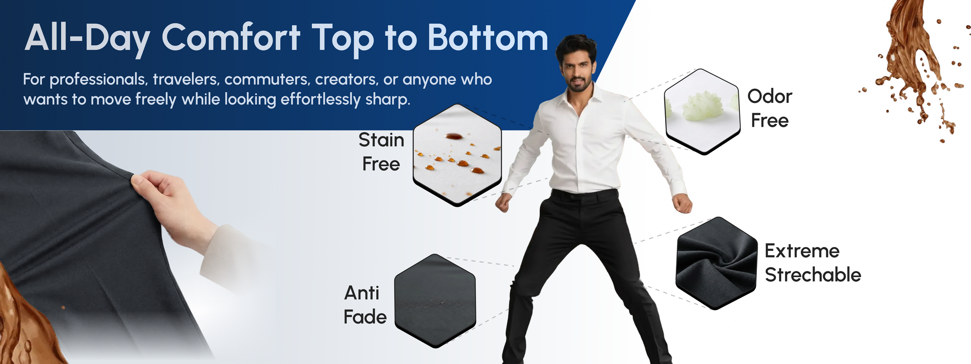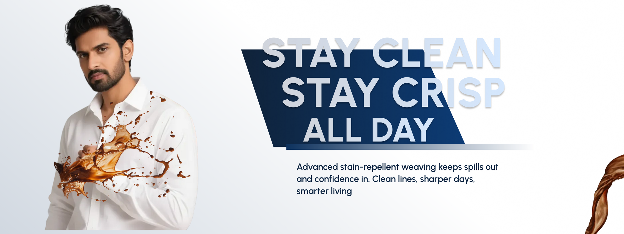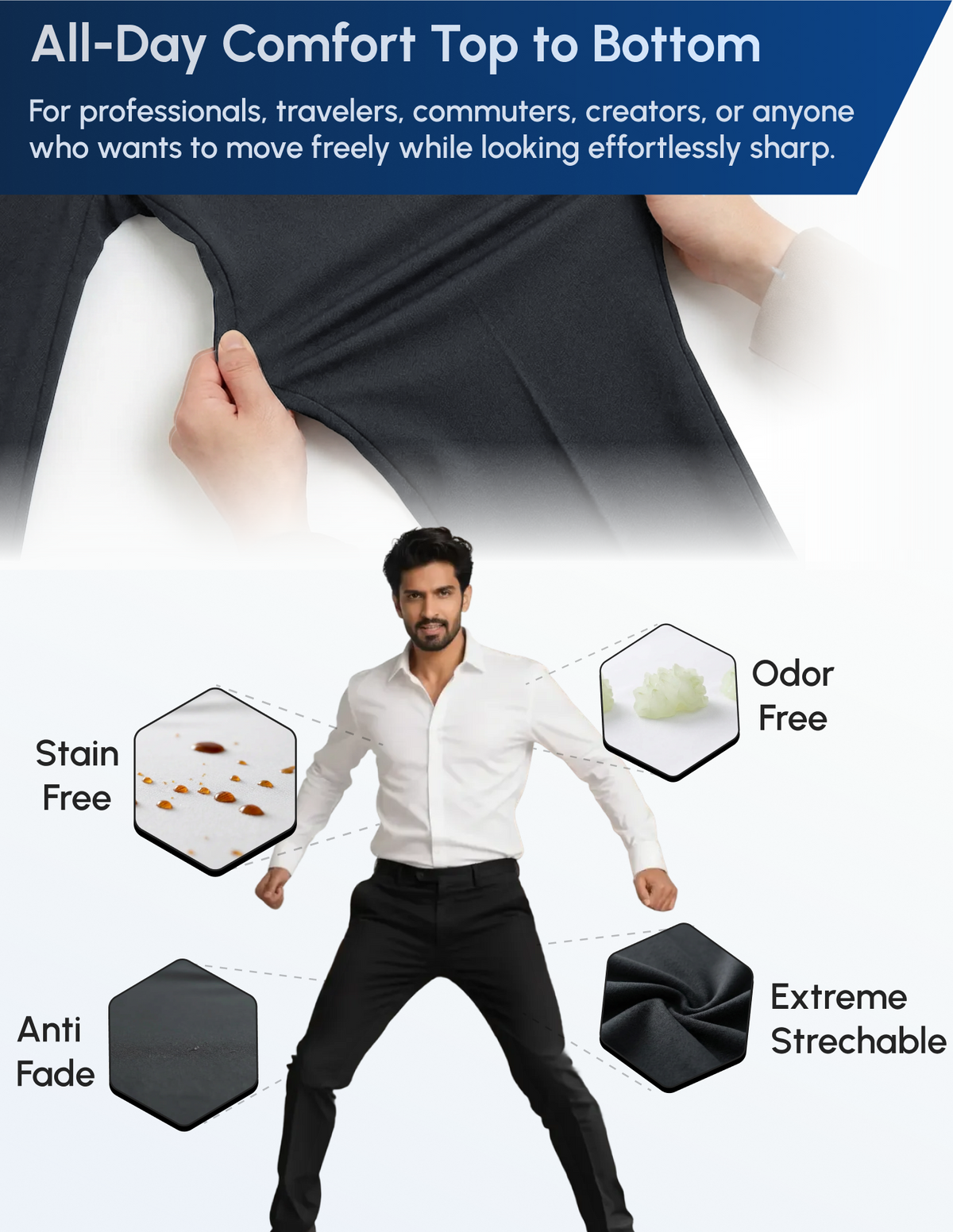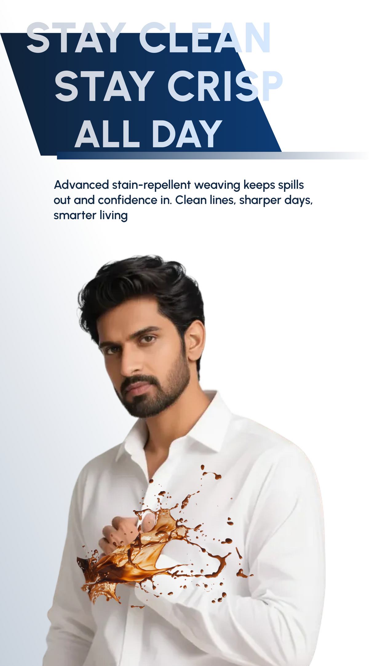 A crisp, stain free full sleeve white shirt paired with our Anti Ball Crushing slim fit pant. The shirt keeps water based stains away and stays effortlessly fresh, while the pant delivers zero pressure comfort, four way stretch, and a wrinkle resistant sharp look. Together, they give you boardroom polish and all day ease.