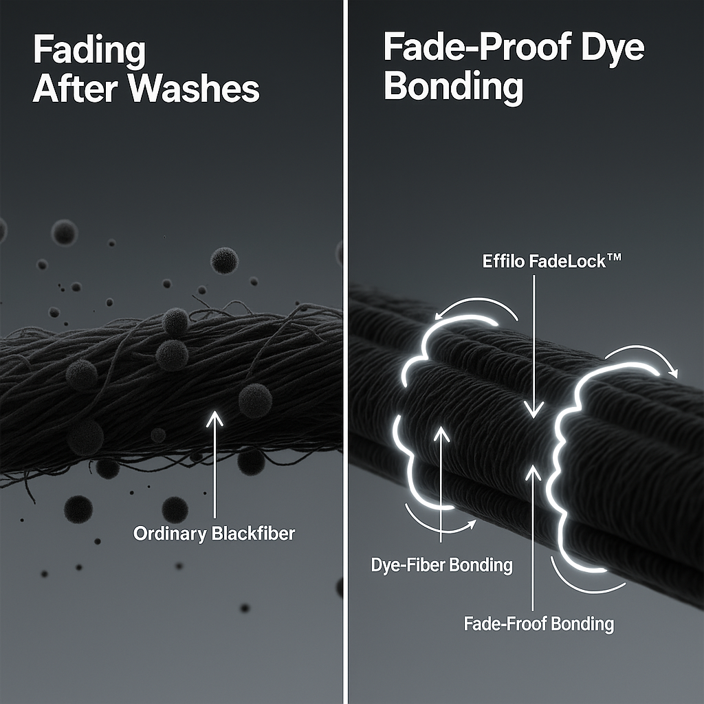 The shirt uses our proprietary FadeLock™ weave, tested through 50+ washes to stay jet black. No fading, no lint, no white dots. The fabric holds shape in heat, humidity and everyday wear, proving that black can stay black.