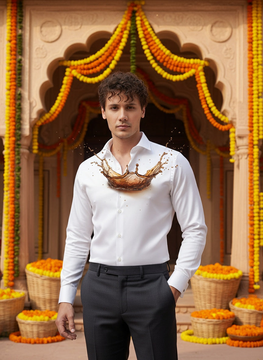 A crisp, stain free full sleeve white shirt paired with our Anti Ball Crushing slim fit pant. The shirt keeps water based stains away and stays effortlessly fresh, while the pant delivers zero pressure comfort, four way stretch, and a wrinkle resistant sharp look. Together, they give you boardroom polish and all day ease.